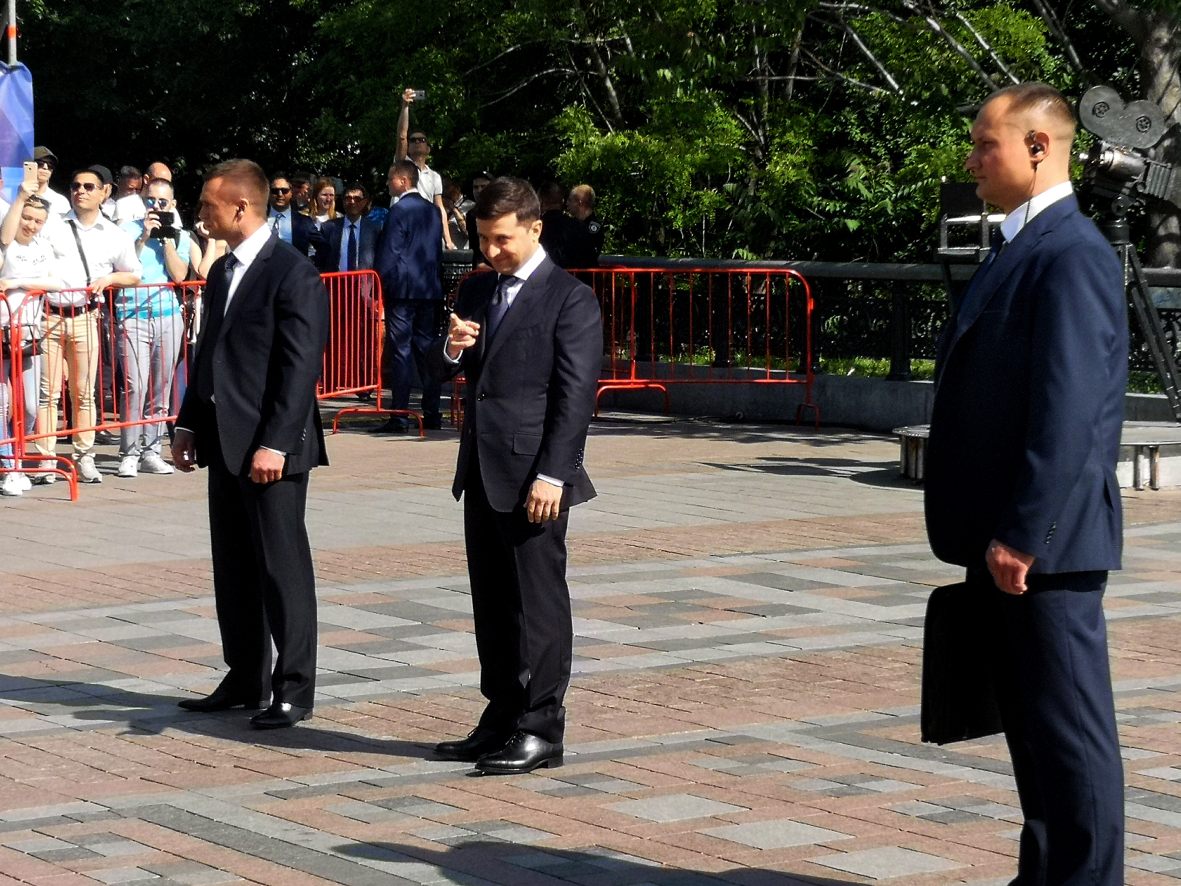 Владимир Зеленский появляется под стенами Верховной Рады неожиданно. Буквально через пять минут он примет присягу и произнесет инаугурационную речь, официально став шестым президентом Украины. Здесь его уже поджидают несколько сотен поклонников, которые тянут к нему руки, просят селфи и кричат "Вова, давай!" Совершенно нет ощущения, что перед нами – президент. Это скорее похоже на встречу актера с фанатами.