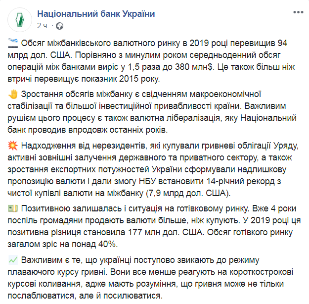 "Положительной оставалась и ситуация на наличном рынке. Уже 4 года подряд граждане продают валюты больше, чем покупают. В 2019 году эта положительная разница составляла 177 млн долл. США. Объем наличного рынка в целом вырос более чем на 40%", - привели статистику в НБУ.