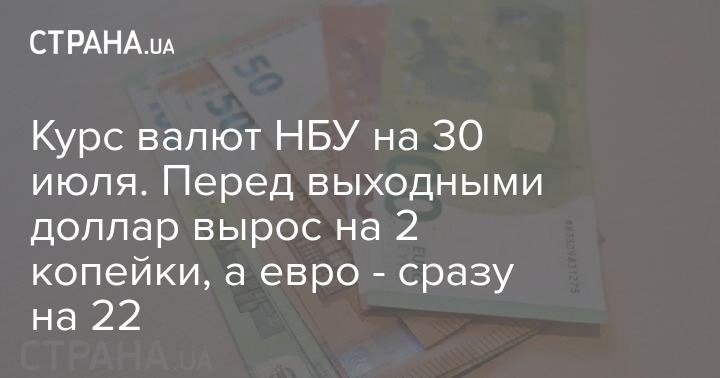 Национальный банк Украины установил официальный курс гривны по отношению к иностранным валютам на пятницу, 30 июля, и ближайшие выходные. По данным регулятора, по сравнению с рабочим днем 29 июля евро значительно вырос в цене, также подорожал и доллар.