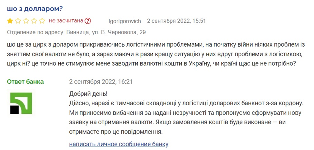 "Договорился, что закажут на следующий день 25.08, звонят утром и тоже говорят, что в Днепре вообще нет у них $. Это или сговор, и держат в себе валюту, но я приказал еще раз, и думаю бесполезно ждать. Если так дальше будет, то, пожалуй, закрою счета, чего всем посоветую тоже. Другие банки выдают доллар без проблем по заказу, для чего эта услуга вообще?" — заметил пострадавший.