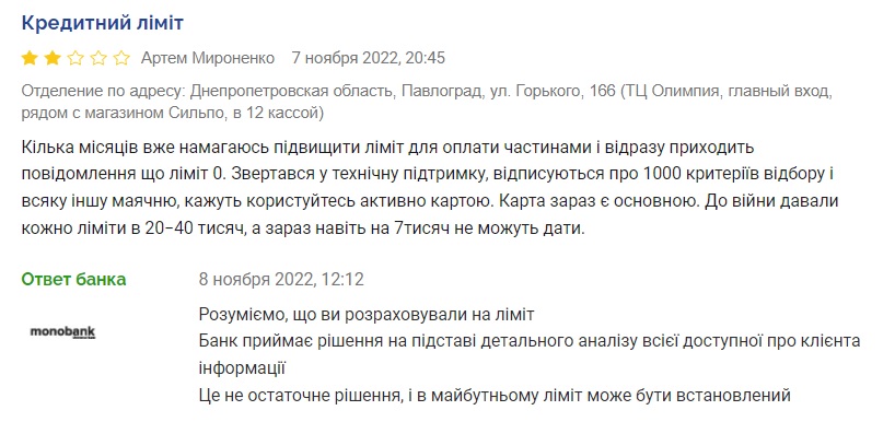 "Понимаем, что вы рассчитывали на лимит. Банк принимает решение на основании детального анализа всей доступной о клиенте информации. Это не окончательное решение, и в будущем лимит может быть восстановлен", — это комментарий Монобанка на обнуление кредитного лимита для Артема Мироненко из Павлограда (Днепропетровская область).