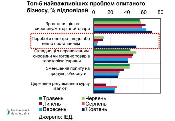 "Перебои с э/э стали второй по значимости проблемой бизнесов после роста цен (указали 51% респондентов, Институт экономических исследований и политических консультаций). Из-за дефицита э/э фактически остановили работы и имеют существенные потери 18% респондентов, 28% отмечают падение оборотов (Advanter). Хотя часть бизнеса приспосабливается к ограничениям, все больше признаков, что восстановление экономической активности прервалось", - отмечается в отчете Национального банка.