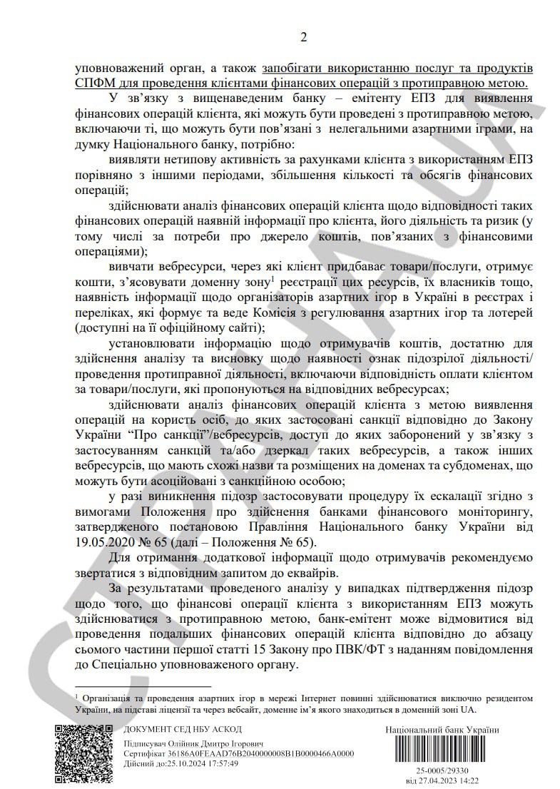 3. Банк должен изучать интернет-сайты, через которые клиент приобретает товары/услуги, получает средства. При этом он обязан устанавливать доменную зону их регистрации, их владельцев и т.п. А также выяснить, есть информация о сайте и его владельцах в реестрах и перечнях украинской КРАИЛ (Комиссии по регулированию азартных игр и лотерей).