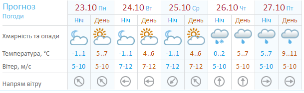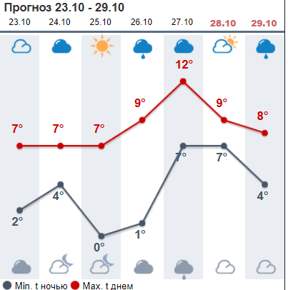 Ресурс Мeteoprog.ua не обещает ни первого снега, ни проливных дождей на пол недели. Синоптики говорят о сухой погоде до четверга, днем +7, ночью 0...+4. В четверг и воскресенье возможен небольшой дождь. Днем потеплеет до +9...+12, ночью до +4...+7.