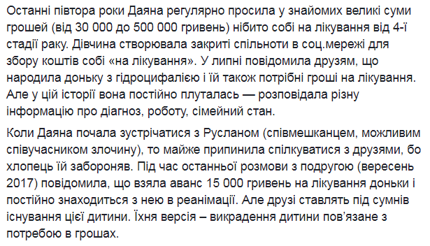 "Последние полтора года Даяна регулярно просила у знакомых крупные суммы денег (от 30 000 до 500 000 гривен) якобы себе на лечение от 4-х стадии рака. Девушка создавала закрытые сообщества в соц.сети для сбора средств себе «на лечение». В июле сообщила друзьям, что родила дочь с гидроцифалиею и ей также нужны деньги на лечение. Но в этой истории она постоянно путалась - рассказывала различную информацию о диагнозе, работу, семейное положение... Во время последнего разговора с подругой (сентябрь 2017) она сообщила, что взяла в долг 15 000 гривен на лечение дочери и постоянно находится с ней в реанимации. Но друзья сомневались в существовании этого ребенка. Их версия - похищение ребенка связано с потребностью в деньгах", - написал на Facebook-странице Уполномоченный Президента Украины по правам ребенка Николай Кулеба.
