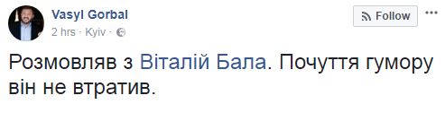 "Разговаривал с Виталием Балой. Чувство юмора он не потерял", - сообщил экс-нардеп.