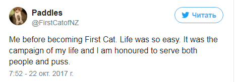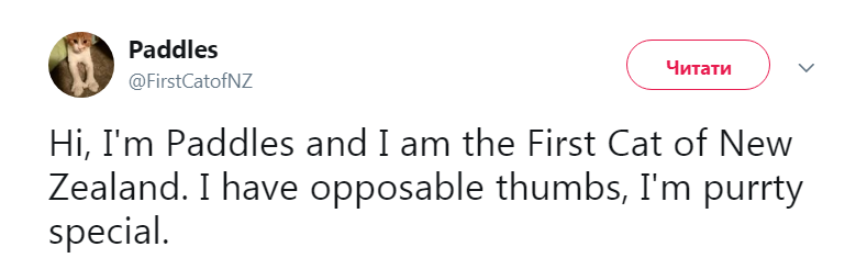 "Привет, я Пэддлс, и я "первая кошка" Новой Зеландии, у меня шесть прибылых пальцев, я особенная", - таким был первый твит кошки премьер-министра.