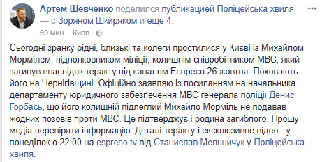 В Министерстве внутренних дел Украины заявили, что их экс-сотрудник Михаил Мормиль, который погиб во время взрыва в Киеве 25 октября, не судился с МВД. Об этом сообщил глава департамента коммуникации МВД Украины Артем Шевченко.