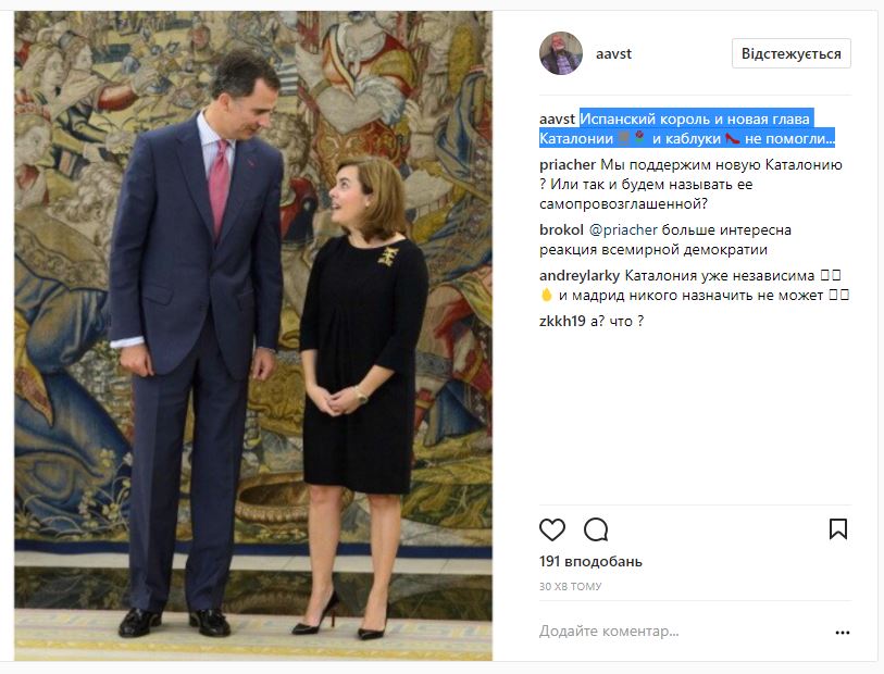В Интернете опубликовано фото, на котором запечатлены король Испании Филипп VI и Сорайя Саэнс де Сантамария, которую накануне назначили главой Каталонии вместо мятежного Карлеса Пучдемона. На фото, которое опубликовал главный редактор "Эха Москвы" Алексей Венедиктов в своем Instagram, Сорайя на высоких шпильках не достает даже до плеча короля.