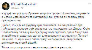 Экс-президент Грузии, лидер партии "Рух новых сил", экс-глава Одесской областной государственной администрации Михаил Саакашвили утверждает, что Луценко готовит его арест и экстрадицию. Об этом он написал на своей странице в Facebook.