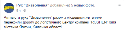 Напомним, что ранее нардеп Егор Соболев заявил, что в ответ на блокирование президентом важных для страны антикоррупционных решений участники МихоМайдана начали блокировать его заработки. При поддержке местных жителей была перекрыта дорога к логистическому центру компании Roshen в Яготине Киевской области. Также в Виннице началось блокирование одноименного завода.