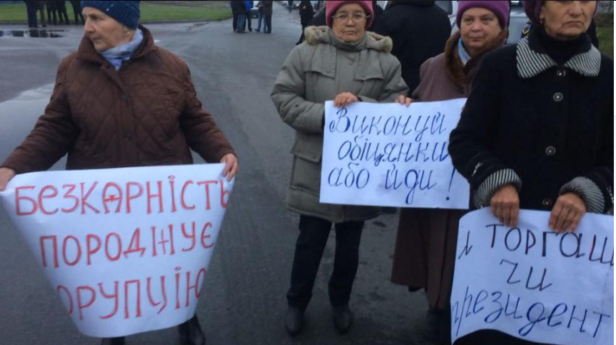 Вчера вечером в Яготине также собрались протестующие и местные жители. Они блокировали проезд к логистическому центру Roshen. С собой они принесли плакаты: "Торгаш или президент", "Безнаказанность порождает коррупцию", "Выполняй обещания или уходи".