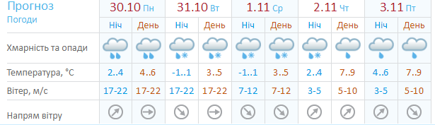 Сайт Sinoptik.ua обещает +5...+10 днем и 0...+7 ночью. Пять дней подряд будут идти дожди, во вторник и среду с мокрым снегом. На выходных обещают погоду без осадков.