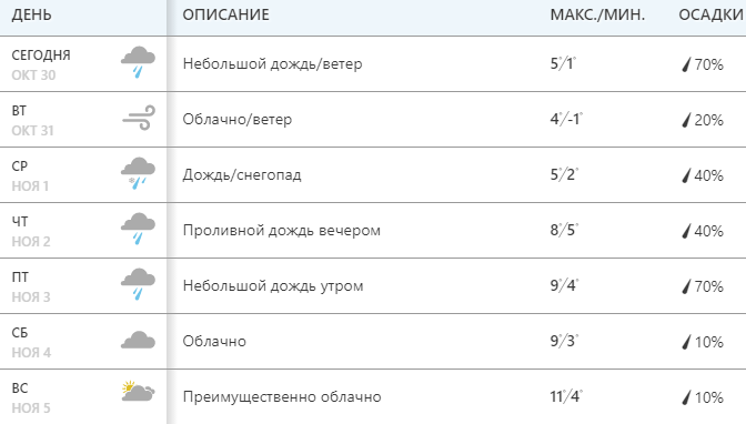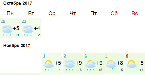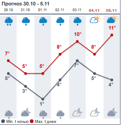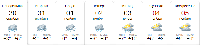 Сайт Gismeteо прогнозирует +4...+5 днем до четверга. А со 2 ноября немного потеплеет до +8...+9 днем. Осадки в виде дождя, во вторник и среду с мокрым снегом, обещают 6 дней подряд. а в воскресенье будет сухо.