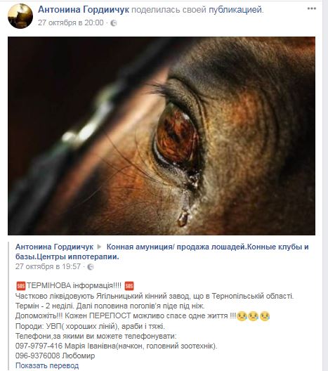 "Частично ликвидируют Ягильницкий конный завод, что в Тернопольской области. Срок - 2 недели. Далее половина поголовья пойдет под нож. Помогите!!!  Породы: УВП (украинская верховая - Ред) хороших линий, арабы и тяжи.Срок - 2 недели. Далее половина поголовья пойдет под нож", - пишет Антонина Гордийчук в Facebook.