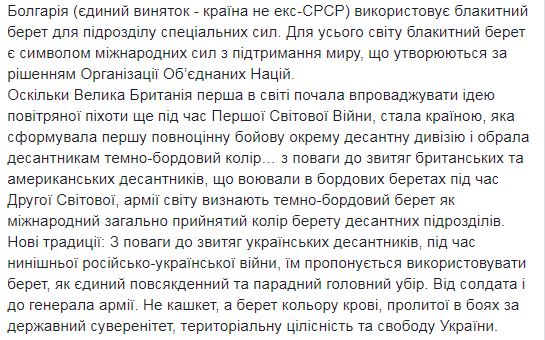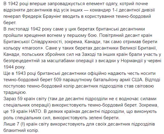 Командование Высокомобильных десантных войск ВСУ сменит цвет беретов десантников с голубого на бордовый. Сообщение об этом опубликовано в Facebook командования.
