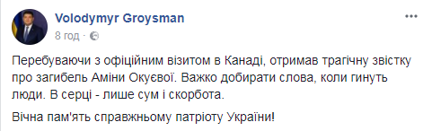 "Находясь с официальным визитом в Канаде, получил трагическое известие о гибели Амины Окуевои. Трудно подбирать слова, когда гибнут люди. На сердце - только печаль и скорбь. Вечная память настоящему патриоту Украины", - написал Владимир Гройсман.