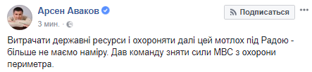 "Тратить государственные ресурсы и охранять дальше этот хлам под Радой - больше не намерены. Дал команду снять силы МВД по охране периметра", - написал он.