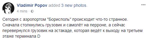 "Сегодня с аэропортом "Борисполь" происходит что-то странное. Сначала столкнулись грузовик и самолёт на перроне, а сейчас перевернулся грузовик на эстакаде, которая ведёт к выходу на третьем этаже терминала D", - пишет он.
