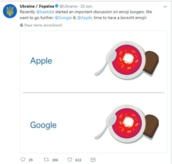 Официальный аккаунт Украины в Twitter попросил Apple и Google создать пиктограмму с тарелкой борща.