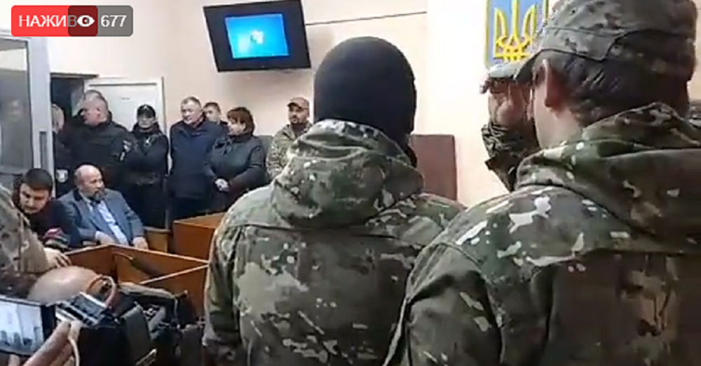 2) во время заседания этот выход заблокирован чуваками в камуфляже и двумя нардепами из НФ, один из которых сидит в кресле судьи, практически за его столом, как член коллегии