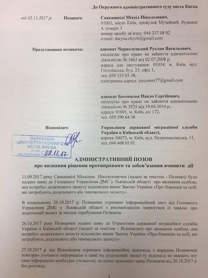 "Защита Михаила Саакашвили обжаловала в суде вчерашнее решение государственной миграционной службы в Киевской области "Об отказе М. Саакашвили в оформлении документов для решения вопроса о признании лицом, которое требует дополнительной защиты", - написал политик.