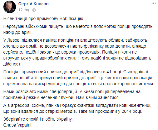 "Чушь о принудительной мобилизации. Неразумные военкомы пишут, что вроде с помощью полиции проводят набор в армию. Во Львове поднялась паника: полицейские устраивают облавы, забирают ребят в армию, не позволяя даже чашечку кофе допить... Если серьезно, подобные заявления - это враждебная провокация. Полиция никогда не вмешивается в дела вооруженных сил. И тому подобные заявления не соответствуют действительности.