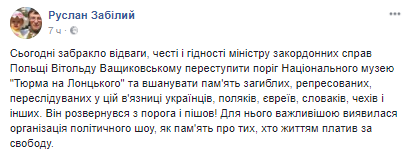 "Сегодня не хватило отваги, чести и достоинства министру иностранных дел Польши Витольду Ващиковскому переступить порог Национального музея "Тюрьма на Лонцкого" и почтить память погибших, репрессированных, преследуемых в этой тюрьме украинцев, поляков, евреев, словаков, чехов и других", - сообщил директор музея.