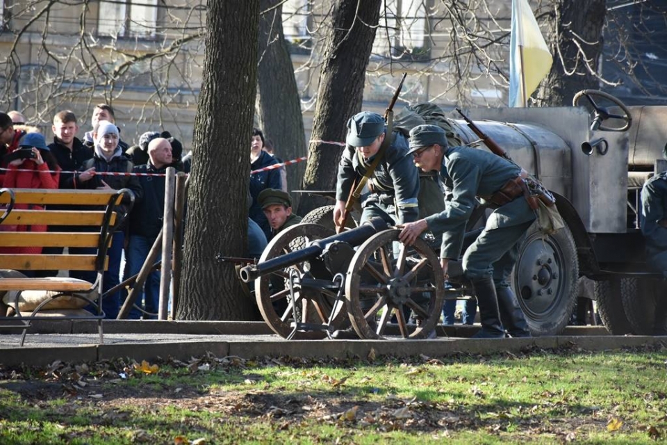 Кроме того, общественная организация "Общество поиска жертв войны "Память" провела перед Ратушей и в сквере "На Валах" театрализованное военно-историческое действо "Бои за столицу – Львов", которое воссоздало события 1918 года.