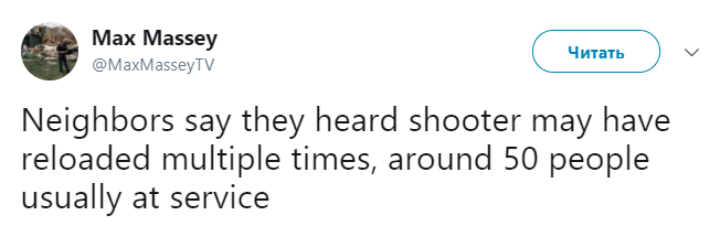 Очевидцы трагедии слышали, как стрелок перезаряжал оружие несколько раз. А утром на службе обычно бывает порядка 50 человек, - об этом сообщает MaxMassey в Twitter.