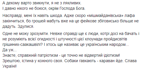 "На самом деле, мне их даже жалко. Ведь скоро "михомайдановская" лафа закончится, потому что денег видимо уже на это фейковое сборище больше не дадут. Вздулись", - продолжает с оскорблениями людей советник министра.