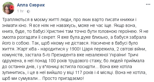 "Если она, книга, будет, то бабушке Кристине там точно быть главной героиней. Я не смогла разгадать ее секрет. Я уже была очень близко, а бабушка забрала его с собой. Так, чтобы никому не достался. Насыщенная у бабушки была жизнь. Шутка разве - родиться в 1900! Царя пережила, 2 мировые войны, коммунистов, застала 5-го президента уже независимой Украины! Трижды замужем, у нее более 100 лет трудового стажа, потому что людей принимала до последних дней, и в тюрьме успела посидеть...", - написала она.