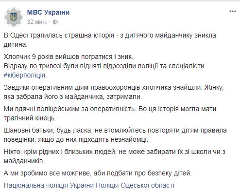 Полиция поймала в Одессе женщину, которая украла девятилетнего мальчика ребенка с детской площадки. Об этом сообщает пресс-служба МВД на своей странице в Facebook.
