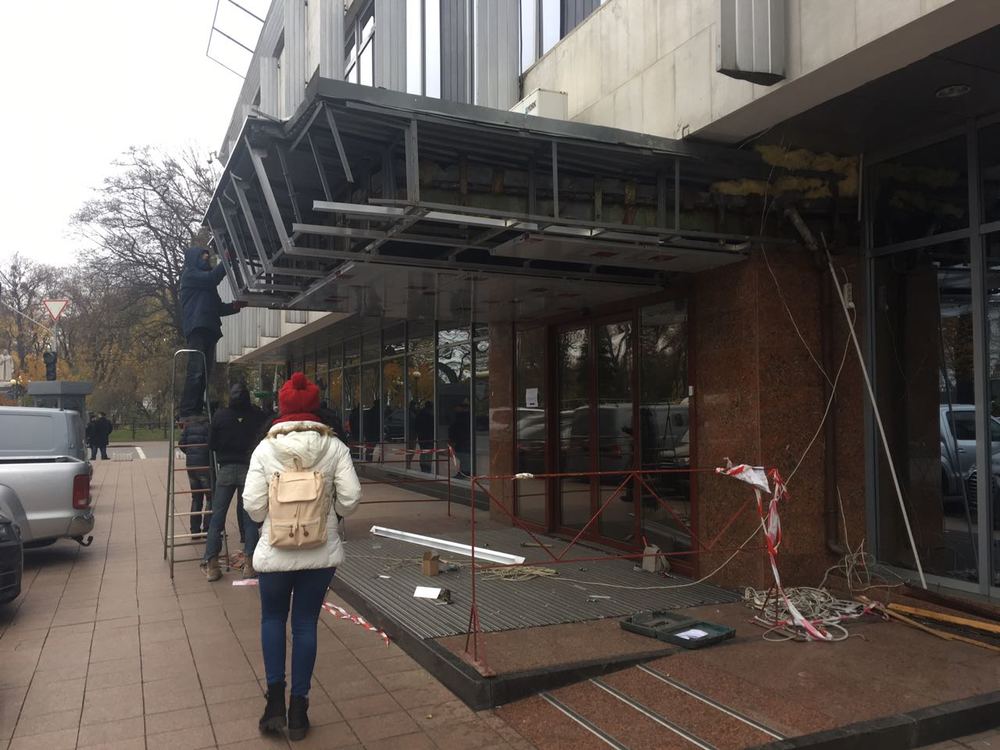 11:41  Фойе гостиницы "Киев" резко закрыли на ремонт фасада. Рабочие ремонтируют крышу и вывеску.