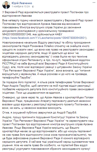 "Зато они вообще не ставят в повестку дня вопрос об отстранении Авакова, потому отстранить министра-силовика на время расследования по его сына как раз очень логично, и депутатам объяснять почему они за это не проголосовали бы значительно сложнее, чем почему они не проголосовали за увольнение Авакова", - написал Левченко.