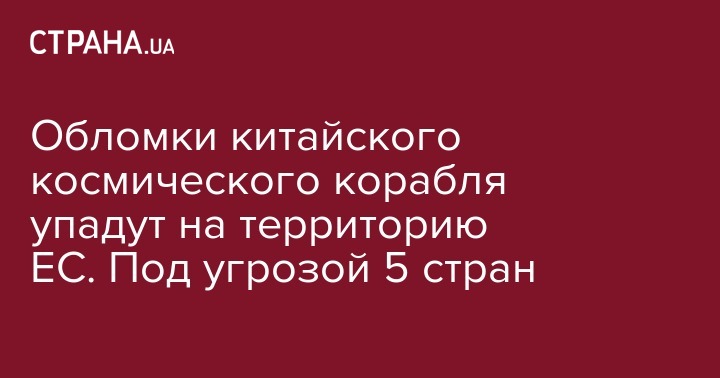 Европейское космическое агентство (ЕКА) заявило, что фрагменты китайского космического корабля Tiangong-1 могут упасть на территорию ЕС южнее 43 градусов северной широты, заявляют в ЕКА.