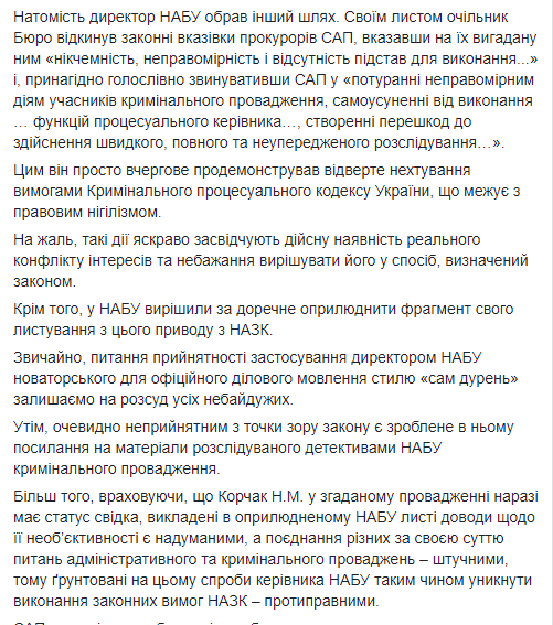 "Директор НАБУ выбрал другой путь. Своим письмом глава Бюро отверг законные указания прокуроров САП, указав на их придуманную им "ничтожность, неправомерность и отсутствие оснований для выполнения …" и, попутно голословно обвинив САП в "попустительстве неправомерным действиям участников уголовного судопроизводства, самоустранении от выполнения … функций процессуального руководителя …, создании препятствий к осуществлению быстрого, полного и беспристрастного расследования", - заявили в САП.