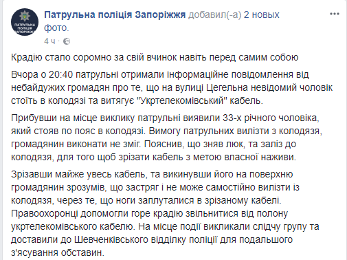 В Запорожье вчера вечером произошел забавный инцидент с вором кабелей. Мужчина застрял в колодце, в который залез нарезать очередные кабели. Об этом сообщает пресс-служба местной полиции.