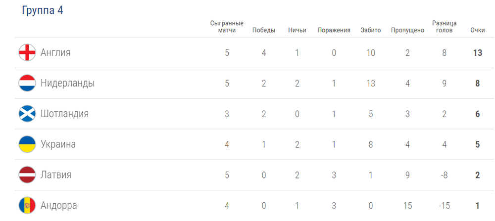 Сборная Англии разместилась на первом месте с 13 баллами.