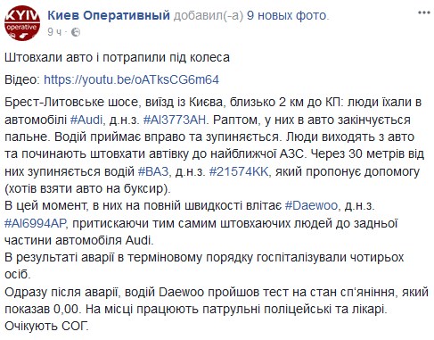 Отмечается, что  в 30 метров от них остановился водитель ВАЗ, который предложил протянуть авто на буксире. Однако на полной скорости в машину влетает Daewoo. В результате четверо человек, которые толкали Audi, были зажаты между автомобилями. Известно о госпитализации четырех человек.