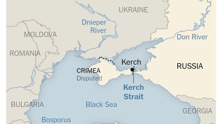 Фрагмент карты, на которой полуостров был окрашен в тот же цвет, что и территория России, и подписан как спорная территория, использовался в материале Нила Макфаркуара и Ивана Нечепуренко "В путинском мосту в Крым будет больше символизма, чем движения по нему" о истории, перспективах и проблемах строительства моста через Керченский пролив.