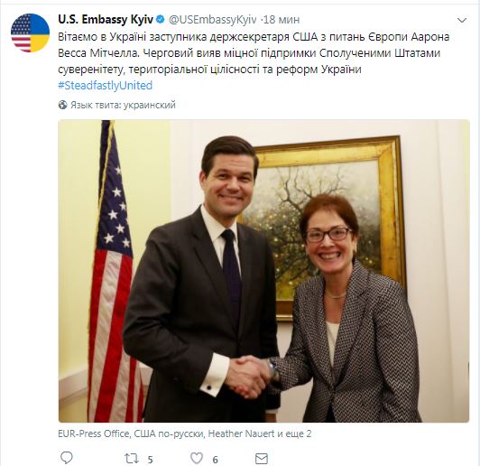 "Добро пожаловать в Украину, помощник госсекретаря по вопросам Европы Уэсс Митчелл. Еще один знак сильной поддержки со стороны США украинскому суверенитету, территориальной целостности и реформ", - пишет пресс-служба.
