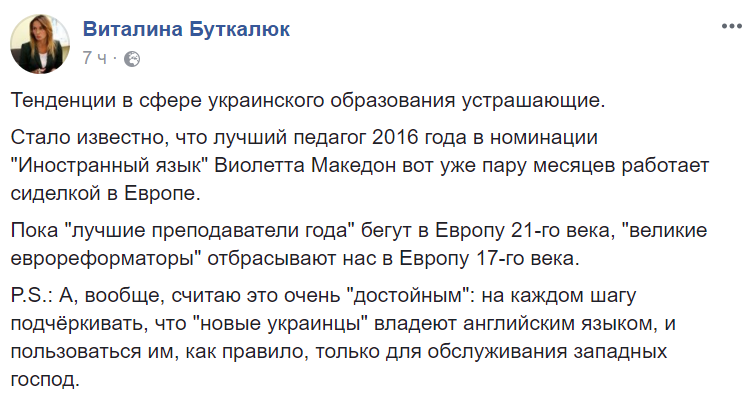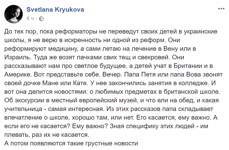 "До тех пор, пока реформаторы не переведут своих детей в украинские школы, я не верю в искренность ни одной из реформ. Они реформируют медицину, а сами летаю на лечение в Вену или в Израиль. Туда же возят пачками свих тещ и свекровей. Они рассказывают нам про светлое будущее, а детей учат в Британии и в Америке. Вот представьте себе. Вечер. Папа Петя или папа Вова звонят своей дочке Мане или Кате. У нее закончились занятия в колледже. И вот она делится новостями: о любимых предметах в британской школе. Об экскурсии в местный европейский музей, и что ели на обед, и какая учительница - самая интересная. Из этих рассказов папа складывает впечатление о школе, хорошо там, или нет. Его касается, ему важно. А если его не касается? Ему важно? Зная специфику этих людей - им плевать, раз их не касается".