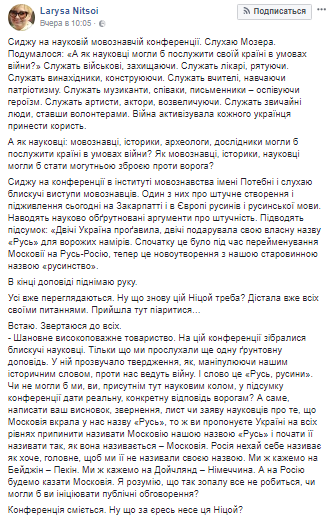"Не могли бы мы, присутствующим здесь научным кругом, в итоге конференции дать реальный, конкретный ответ врагам? А именно, написать вывод, обращение, письмо или заявление ученых о том, что Московия украла у нас название "Русь" - написала Ницой.
