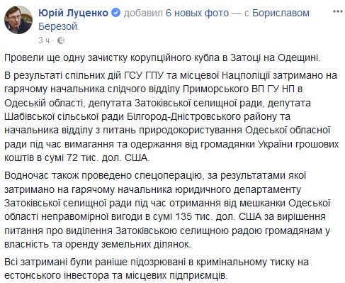 "Провели еще одну зачистку коррупционного гнезда в Затоке в Одесской области. В результате совместных действий ГСУ ГПУ и местной Нацполиции задержаны с поличным начальник следственного отдела Приморского ОП ГУ Нацполиции в Одесской области, депутат Затоковского поселкового совета, депутат Шабского сельского совета Белгород-Днестровского района и начальник отдела по вопросам природопользования Одесского областного совета во время вымогательства и получения от гражданки Украины денежных средств в сумме 72 тыс. долл. США", - заявил Луценко.