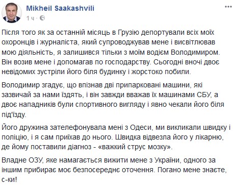 "После того как за последний месяц в Грузию депортировали всех моих охранников и журналиста, который сопровождал меня и освещал мою деятельность, я остался только с моим водителем Владимиром. Он возил меня и помогал по хозяйству. Сегодня ночью два неизвестных встретили его возле дома и жестоко избили. Владимир вспоминает, что узнал две припаркованные машины, которые обычно за нами ездят, и он всегда считал их машинами СБУ, а двое нападавших были спортивного вида и явно ждали его у подъезда", – рассказал он.