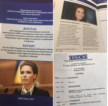 "По приглашению БДИПЧ, как директор Института правовой политики и социальной защиты имени Ирины Бережной, я приняла участие 16 и 17 ноября в совещание по гуманитарным аспектам деятельности ОБСЕ, посвящённого доступу к правосудию в качестве ключевого элемента верховенства права. В первый день совещания в своём выступление обратила внимание участников на тотальное неисполнение украинской властью решений национальных судов и ЕСПЧ , приведя пример по циничному игнорированию постановления суда по возобновлению выплат пенсий и социальных доплат гражданам, которые проживают на неконтролируемой государством территории", - написала мать Бережной.