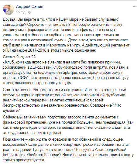 "Друзья, вы верите в то, что в нашем мире не бывает случайных совпадений? Спросите - о чем это я? Попробую объяснить - в эту пятницу мы сформировали и отправили в офис одного весьма уважаемого футбольного клуба формализованную претензию на компенсацию шестизначной суммы. Дело в том, что как-то летом этот клуб взял и не явился в Мариуполь на игру. А действующий регламент УПЛ на сезон 2017-2018 в этом смысле однозначен: