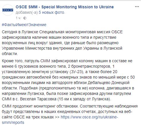 Специальная мониторинговая миссия ОБСЕ наблюдала автоколонну в составе армейских грузовиков, бронетранспортеров и гражданских автомобилей с вооруженными лицами, которая, вероятно, проследовала с территории т.н. "ДНР" в направлении Луганска.