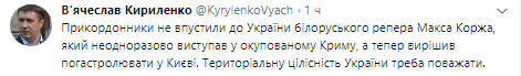 "Пограничники не пустили в Украину белорусского рэпера Макса Коржа, который неоднократно выступал в оккупированном Крыму, а теперь решил гастролировать в Киеве. Территориальную целостность Украины надо уважать", — написал Кириленко сегодня, 22 ноября.